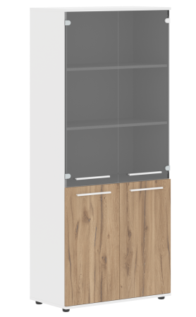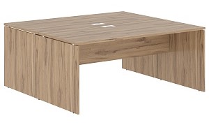 Технические характеристики: толщина столешниц столов, топы тумб, шкафов ЛДСП 25 мм., остальные детали 18 мм. Соединение столешницы и опор через металлические проставки. На столешнице есть металлический кабель-канал 160х80х25 мм. Задняя стенка тумб и шкафов ЛДСП. Тумбы оснащены телескопическими направляющими плавного хода, два колеса имеют стопоры. Фасады без ручек, открывание ящиков за счёт удлинённый стороны фасадов. Центральные замки на тумбах и слайд-дверях. Стеклянные двери тонированные "бронза серое" в металлической раме. Столы письменные имеют ширину 670 мм и 800 мм. Опоры столов из ЛДСП или металлические опоры V - формы 60 х 30 мм