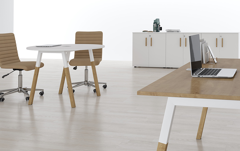 Современная офисная мебель Forta. У столов - уникальные комбинированные опоры: сверху – прочный металлокаркас с двумя траверсами, а нижние части – натуральное дерево, массив бука.