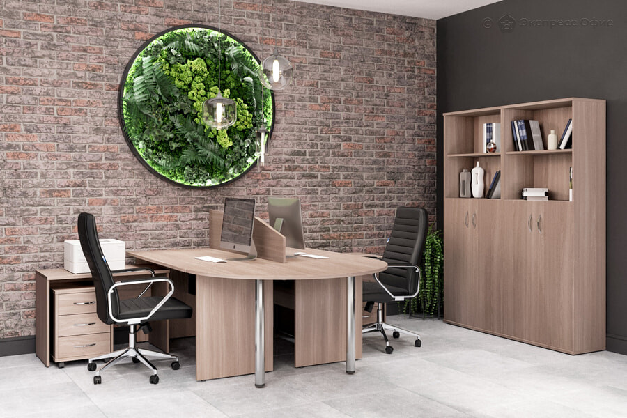Технические характеристики: толщина столешниц столов, топы тумб, шкафов ЛДСП 22 мм., остальные детали 18 мм. Регулируемые опоры, диапазон регулировок до 15 мм. Ящики тумб фолдинг 12 мм. Замки на верхних ящиках тумб.